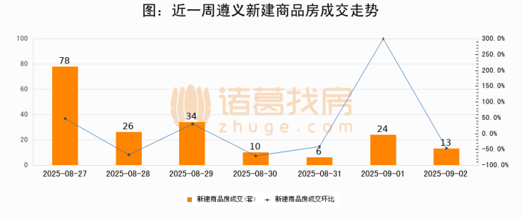 根据遵义市住房和城乡建设局数据显示,2025年09月02日遵义新建商品房成交13套,较昨日减少11套,环比下降45.8%