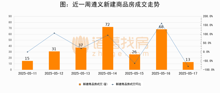 根据遵义市住房和城乡建设局数据显示,2025年05月17日遵义新建商品房成交13套,较昨日减少55套,环比下降80.9%