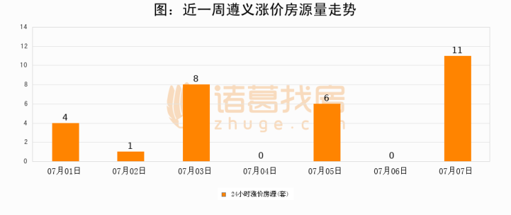 根据诸葛找房数据显示,遵义24小时涨价房源量为11套,较07月06日增加11套,环比上涨0%。与此同时,涨价房源占比小幅扩大,业主信心有所提升。