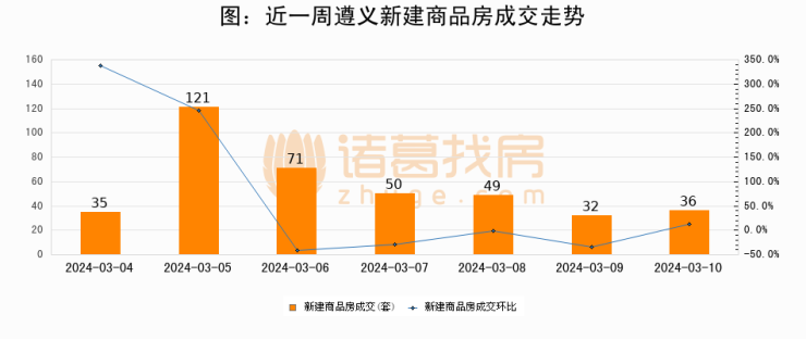 根据遵义市住房和城乡建设局数据显示,2024年03月10日遵义新建商品房成交36套,较昨日增加4套,环比上涨12.5%