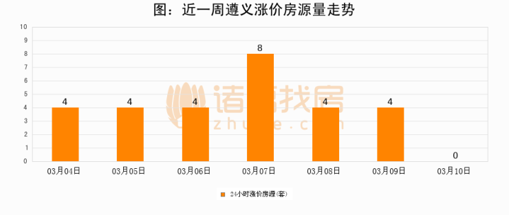 根据诸葛找房数据显示,遵义24小时涨价房源量为0套,较03月09日减少4套,环比下降100%。与此同时,涨价房源占比小幅回落,对于购房者来说是一个入市窗口期,购房者可抓住时机入市。
