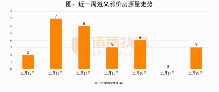 根据诸葛找房数据显示,遵义24小时涨价房源量为3套,较11月17日增加3套,环比上涨0%。与此同时,涨价房源占比小幅扩大,业主信心有所提升。