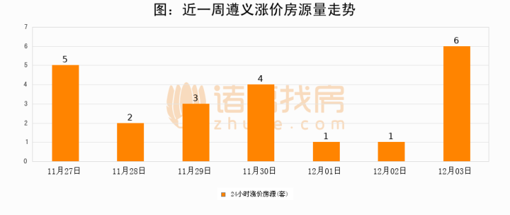 根据诸葛找房数据显示,遵义24小时涨价房源量为6套,较12月02日增加5套,环比上涨500%。与此同时,涨价房源占比小幅扩大,业主信心有所提升。