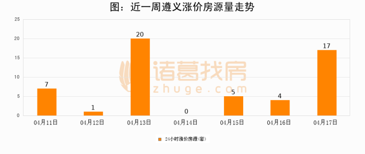 根据诸葛找房数据显示,遵义24小时涨价房源量为17套,较04月16日增加13套,环比上涨325%。与此同时,涨价房源占比小幅扩大,业主信心有所提升。