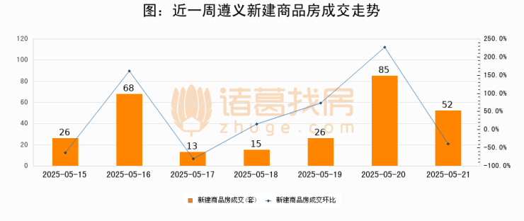 根据遵义市住房和城乡建设局数据显示,2025年05月21日遵义新建商品房成交52套,较昨日减少33套,环比下降38.8%。近一周遵义新建商品房日均成交41套。05月21日单日成交52套,高于近一周平均水平26.8%。