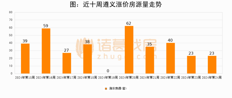 从调价房源来看,第24周遵义涨价房源23套,较上周持平。与此同时,24周涨价房源占比提升2.24个百分点,业主信心持续恢复。