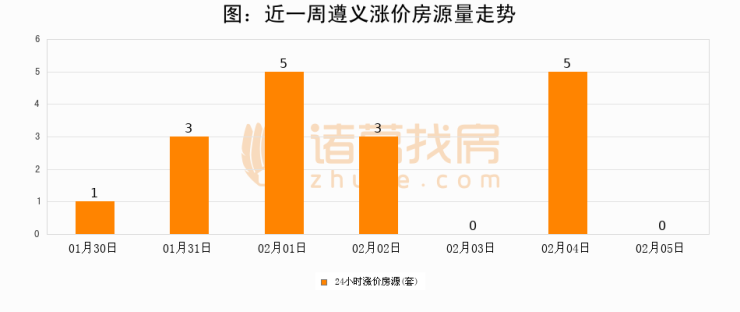 根据诸葛找房数据显示,遵义24小时涨价房源量为0套,较02月04日减少5套,环比下降100%。与此同时,涨价房源占比小幅回落,对于购房者来说是一个入市窗口期,购房者可抓住时机入市。