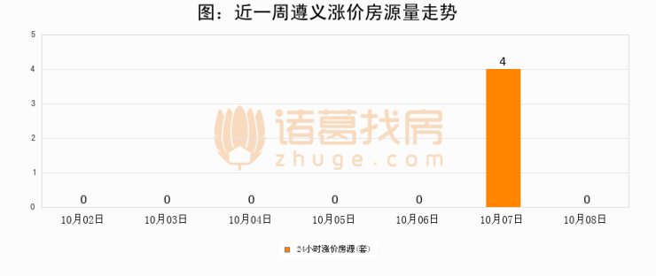 根据诸葛找房数据显示,遵义24小时涨价房源量为0套,较10月07日减少4套,环比下降100%。与此同时,涨价房源占比小幅回落,对于购房者来说是一个入市窗口期,购房者可抓住时机入市。