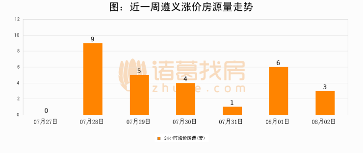 根据诸葛找房数据显示,遵义24小时涨价房源量为3套,较08月01日减少3套,环比下降50%。与此同时,涨价房源占比小幅回落,对于购房者来说是一个入市窗口期,购房者可抓住时机入市。