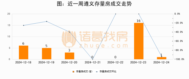 从存量房来看,2024年12月24日遵义存量房单日成交1套,比昨日减少15套,环比下降93.8%。从近一周存量房成交来看,遵义存量房日均成交套数为4套,12月24日单日成交1套,低于近一周平均水平75%。