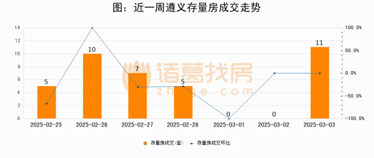 从存量房来看,2025年03月03日遵义存量房单日成交11套,比昨日增加11套,环比上涨0%。从近一周存量房成交来看,遵义存量房日均成交套数为5套,03月03日单日成交11套,高于近一周平均水平120%。