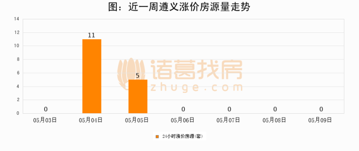 根据诸葛找房数据显示,遵义24小时涨价房源量为0套,较05月08日持平。