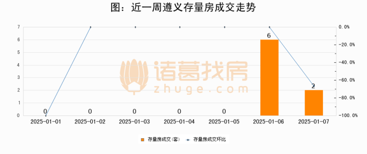 从存量房来看,2025年01月07日遵义存量房单日成交2套,比昨日减少4套,环比下降66.7%。从近一周存量房成交来看,遵义存量房日均成交套数为1套,01月07日单日成交2套,高于近一周平均水平100%。