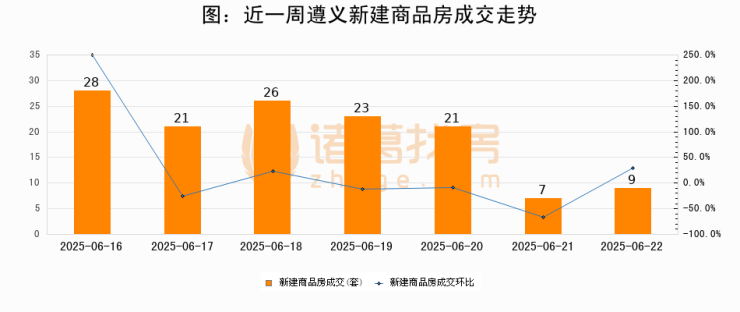 根据遵义市住房和城乡建设局数据显示,2025年06月22日遵义新建商品房成交9套,较昨日增加2套,环比上涨28.6%