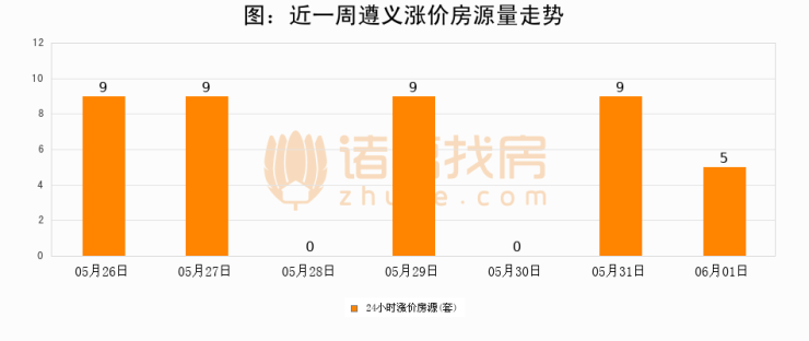 根据诸葛找房数据显示,遵义24小时涨价房源量为5套,较05月31日减少4套,环比下降44.4%。与此同时,涨价房源占比小幅回落,对于购房者来说是一个入市窗口期,购房者可抓住时机入市。