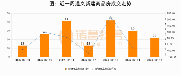 根据遵义市住房和城乡建设局数据显示,2025年02月15日遵义新建商品房成交22套,较昨日减少8套,环比下降26.7%