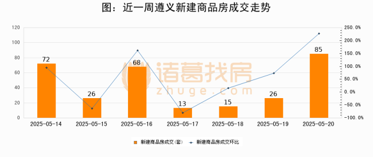 根据遵义市住房和城乡建设局数据显示,2025年05月20日遵义新建商品房成交85套,较昨日增加59套,环比上涨226.9%