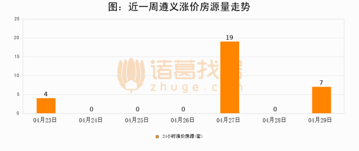根据诸葛找房数据显示,遵义24小时涨价房源量为7套,较04月28日增加7套,环比上涨0%。与此同时,涨价房源占比小幅扩大,业主信心有所提升。