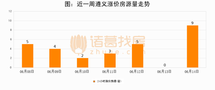 根据诸葛找房数据显示,遵义24小时涨价房源量为9套,较06月13日增加9套,环比上涨0%。与此同时,涨价房源占比小幅扩大,业主信心有所提升。
