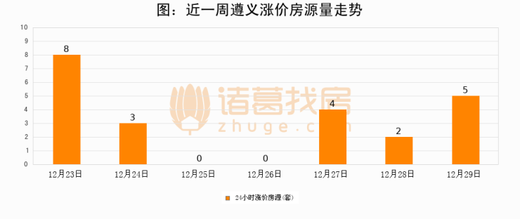 根据诸葛找房数据显示,遵义24小时涨价房源量为5套,较12月28日增加3套,环比上涨150%。与此同时,涨价房源占比小幅扩大,业主信心有所提升。