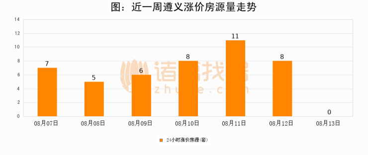根据诸葛找房数据显示,遵义24小时涨价房源量为0套,较08月12日减少8套,环比下降100%。与此同时,涨价房源占比小幅回落,对于购房者来说是一个入市窗口期,购房者可抓住时机入市。
