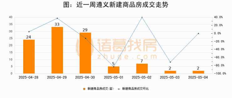 根据遵义市住房和城乡建设局数据显示,2025年05月04日遵义新建商品房成交2套,较昨日持平
