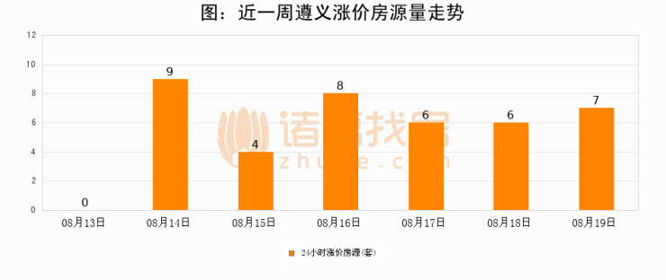 根据诸葛找房数据显示,遵义24小时涨价房源量为7套,较08月18日增加1套,环比上涨16.7%。与此同时,涨价房源占比小幅扩大,业主信心有所提升。