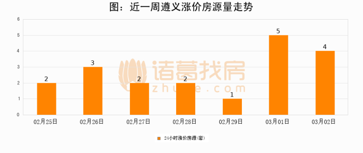根据诸葛找房数据显示,遵义24小时涨价房源量为4套,较03月01日减少1套,环比下降20%。与此同时,涨价房源占比小幅回落,对于购房者来说是一个入市窗口期,购房者可抓住时机入市。