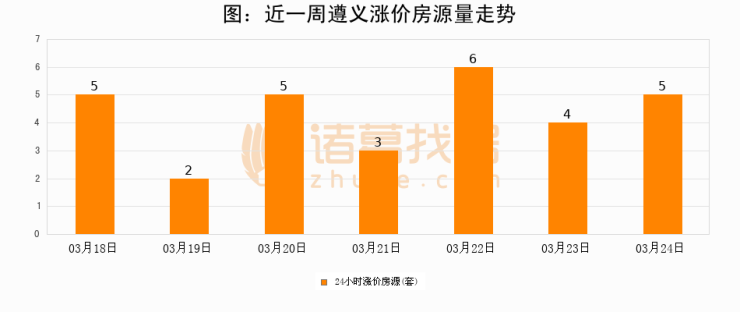 根据诸葛找房数据显示,遵义24小时涨价房源量为5套,较03月23日增加1套,环比上涨25%。与此同时,涨价房源占比小幅扩大,业主信心有所提升。