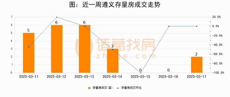 从存量房来看,2025年03月17日遵义存量房单日成交2套,比昨日增加2套,环比上涨0%。从近一周存量房成交来看,遵义存量房日均成交套数为3套,03月17日单日成交2套,低于近一周平均水平33.3%。