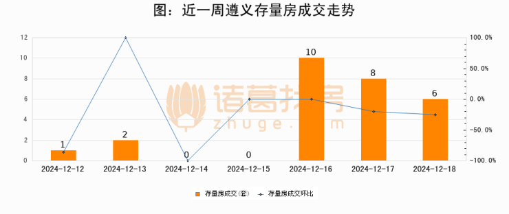 从存量房来看,2024年12月18日遵义存量房单日成交6套,比昨日减少2套,环比下降25%。从近一周存量房成交来看,遵义存量房日均成交套数为3套,12月18日单日成交6套,高于近一周平均水平100%。