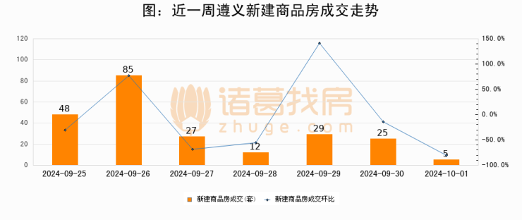 根据遵义市住房和城乡建设局数据显示,2024年10月01日遵义新建商品房成交5套,较昨日减少20套,环比下降80%
