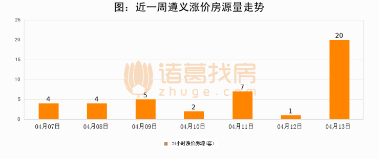 根据诸葛找房数据显示,遵义24小时涨价房源量为20套,较04月12日增加19套,环比上涨1900%。与此同时,涨价房源占比小幅扩大,业主信心有所提升。