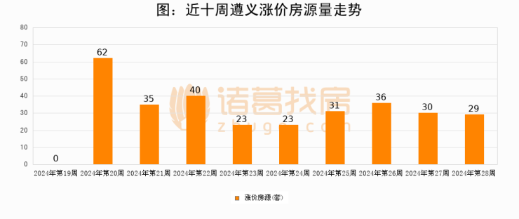 从调价房源来看,第28周遵义涨价房源29套,较上周下降3.3%。与此同时,28周涨价房源占比提升1.81个百分点,业主信心持续恢复。