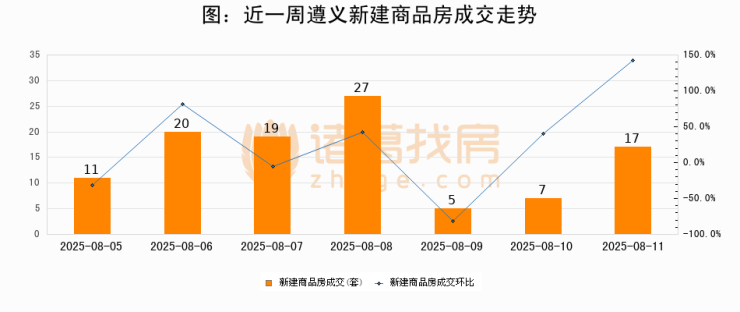 根据遵义市住房和城乡建设局数据显示,2025年08月11日遵义新建商品房成交17套,较昨日增加10套,环比上涨142.9%
