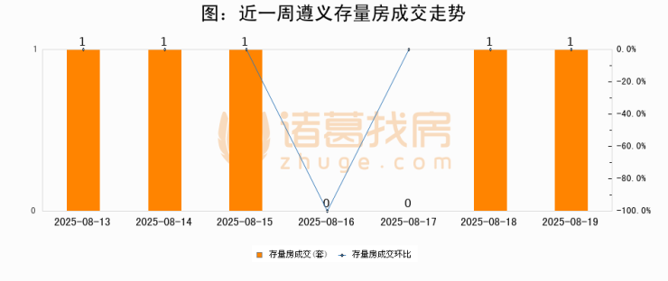 从存量房来看,2025年08月19日遵义存量房单日成交1套,比昨日持平。。从近一周存量房成交来看,遵义存量房日均成交套数为0套,08月19日单日成交1套,高于近一周平均水平0%。