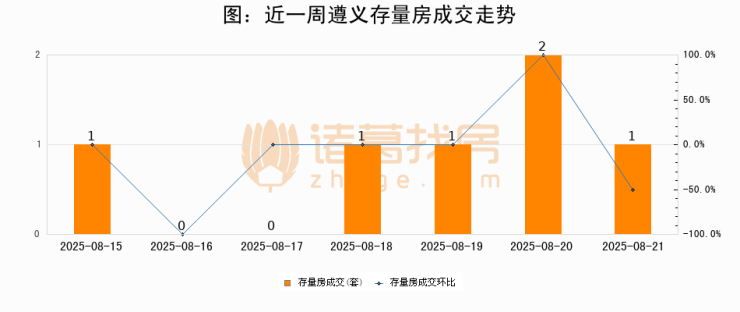 从存量房来看,2025年08月21日遵义存量房单日成交1套,比昨日减少1套,环比下降50%。从近一周存量房成交来看,遵义存量房日均成交套数为0套,08月21日单日成交1套,高于近一周平均水平0%。