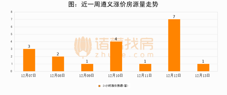 根据诸葛找房数据显示,遵义24小时涨价房源量为1套,较12月12日减少6套,环比下降85.7%。与此同时,涨价房源占比小幅回落,对于购房者来说是一个入市窗口期,购房者可抓住时机入市。