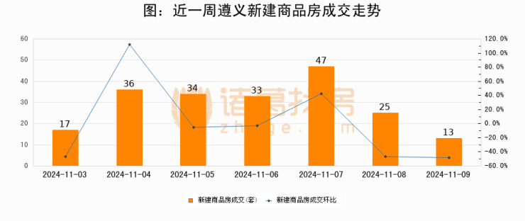 根据遵义市住房和城乡建设局数据显示,2024年11月09日遵义新建商品房成交13套,较昨日减少12套,环比下降48%
