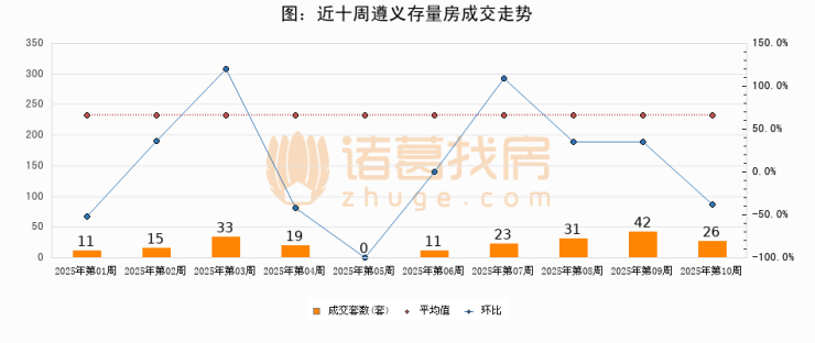 存量房方面,第10周遵义存量房成交26套,较上周减少16套,环比下降38.1%。从近十周成交走势来看,周均成交套数为21套,本周高于平均水平23.8%。