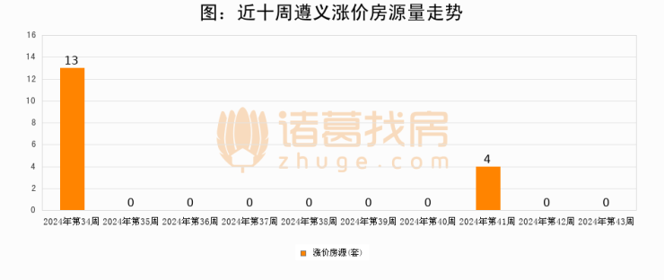 从调价房源来看,第43周遵义涨价房源0套,较上周持平。与此同时,43周涨价房源占比持平