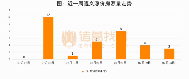根据诸葛找房数据显示,遵义24小时涨价房源量为3套,较07月22日减少1套,环比下降25%。与此同时,涨价房源占比小幅回落,对于购房者来说是一个入市窗口期,购房者可抓住时机入市。