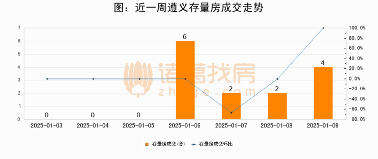 从存量房来看,2025年01月09日遵义存量房单日成交4套,比昨日增加2套,环比上涨100%。从近一周存量房成交来看,遵义存量房日均成交套数为2套,01月09日单日成交4套,高于近一周平均水平100%。