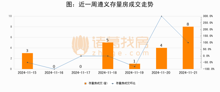 从存量房来看,2024年11月21日遵义存量房单日成交8套,比昨日增加4套,环比上涨100%。从近一周存量房成交来看,遵义存量房日均成交套数为3套,11月21日单日成交8套,高于近一周平均水平166.7%。