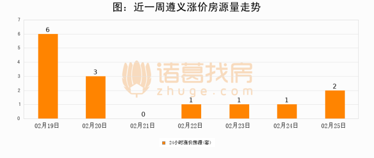 根据诸葛找房数据显示,遵义24小时涨价房源量为2套,较02月24日增加1套,环比上涨100%。与此同时,涨价房源占比小幅扩大,业主信心有所提升。