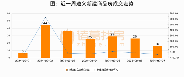 根据遵义市住房和城乡建设局数据显示,2024年09月07日遵义新建商品房成交16套,较昨日减少10套,环比下降38.5%