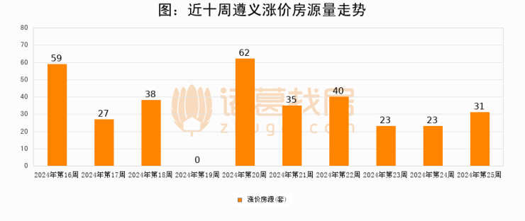 从调价房源来看,第25周遵义涨价房源31套,较上周上涨34.8%。与此同时,25周涨价房源占比回落0.25个百分点,业主信心小幅波动,购房者可则需入市。