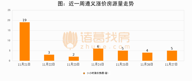 根据诸葛找房数据显示,遵义24小时涨价房源量为5套,较11月26日增加1套,环比上涨25%。与此同时,涨价房源占比小幅扩大,业主信心有所提升。
