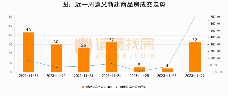 根据遵义市住房和城乡建设局数据显示,2023年11月27日遵义新建商品房成交32套,较昨日增加28套,环比上涨700%