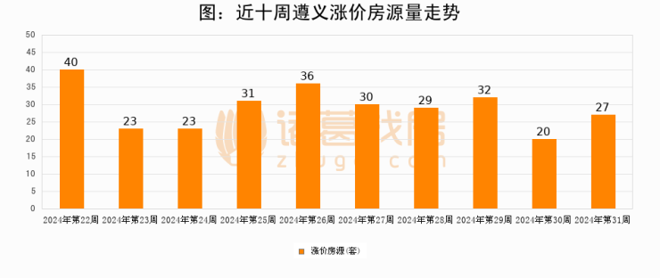 从调价房源来看,第31周遵义涨价房源27套,较上周上涨35%。与此同时,31周涨价房源占比提升1.41个百分点,业主信心持续恢复。